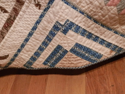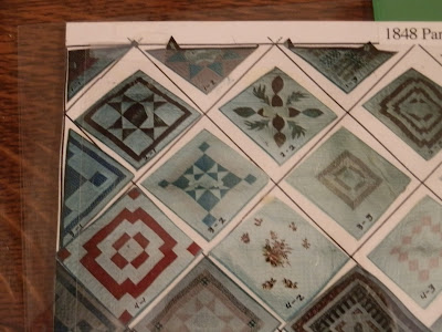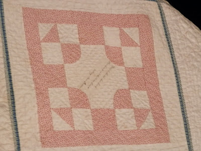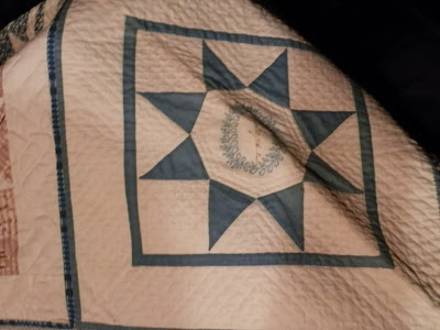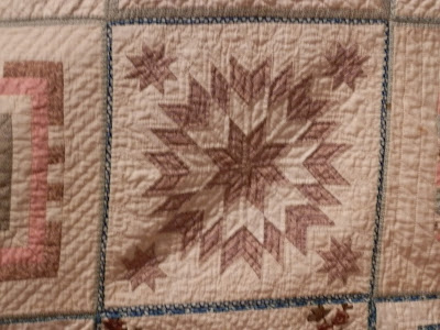 The quilt was made in 1848, in the pot-holder style of quilt making. Pam Weeks, the curator of the Lowell Quilt Museum, in Massachusetts, has researched and written about this uniquely-Maine style of quilt assembly, and the museum lady told me that Pam has been to the museum, studied the quilt and related papers and photos, and it could be included in a future book! Nice!