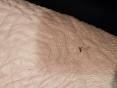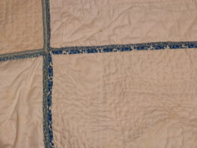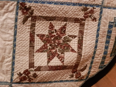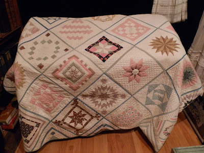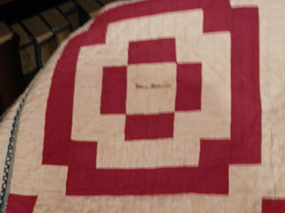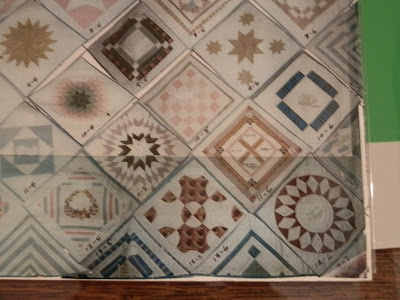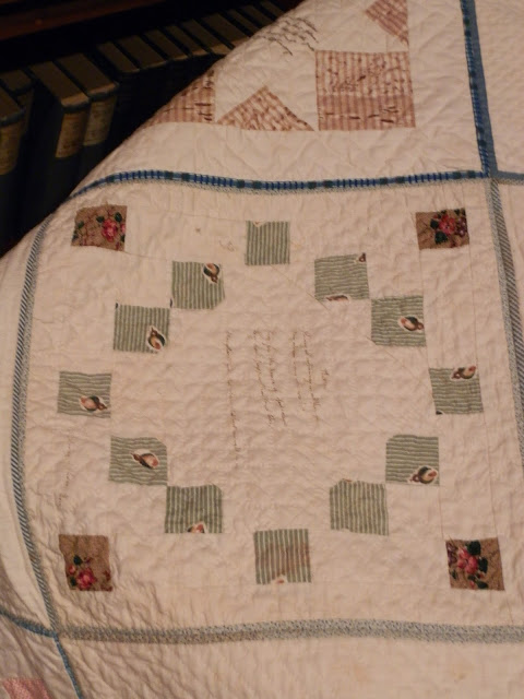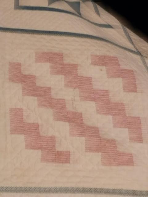 The museum lady and I were the only two in the place (it's also the town library on the first floor), so she went with me upstairs to where the quilt is on display. She went under the rope, and got on her white gloves, and I asked if pictures were allowed. She said yes, so I started to take a few pictures. Then I said, "Do you mind if I get in there with you to get closer pics?" and before she had a chance to say no, I was under the rope, and clicking away! HA! I assured her I wouldn't touch the quilt, and through my conversation with her, she realized I knew about antiques quilts and their care, so I think she was ok with me so close.