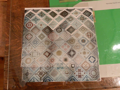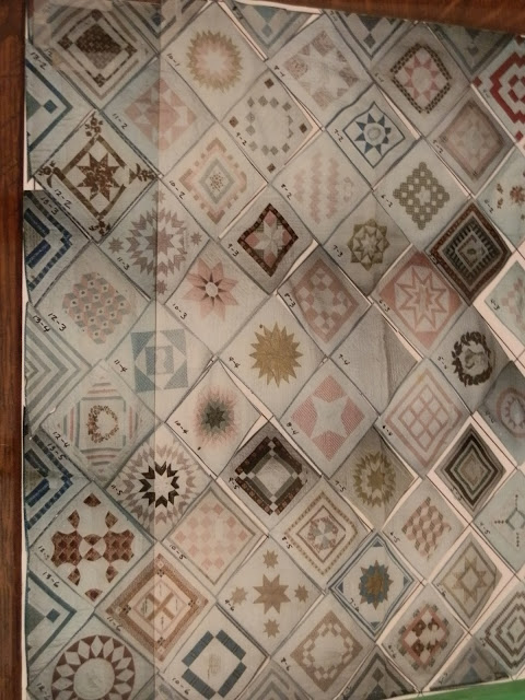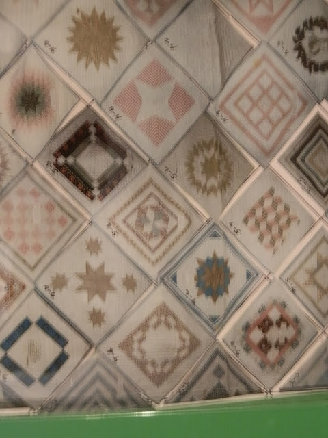 After finishing taking the pics, I turned to get back under the rope, and that's when I saw a mock up of the quilt on a chair. It is made with photos of each block, then cut and pasted into place, then plastic coated to preserve it, with codes corresponding to the pages in a notebook detailing the info on each block. I asked if I could take pictures of this mock-up, and she said yes! Yippee! Some of the blocks are a bit blurred, but it gives you an idea of what each block looks like.