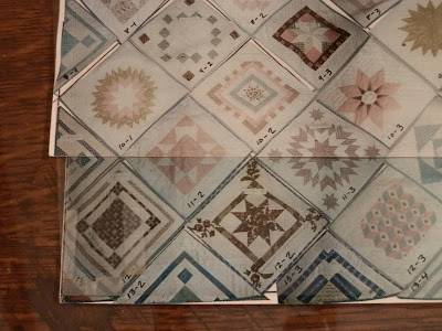 From the museum website:.....The quilt consists of 61 complete squares, each approximately 11 1/2" square, set "on point" surrounded with 20 half-square triangles and 4 quarter-square triangles and measures 101" x 101". It is particularly interesting because each square was finished individually with narrow binding and then the finished squares were sewn together. The quilting is expertly done with tiny stitches.