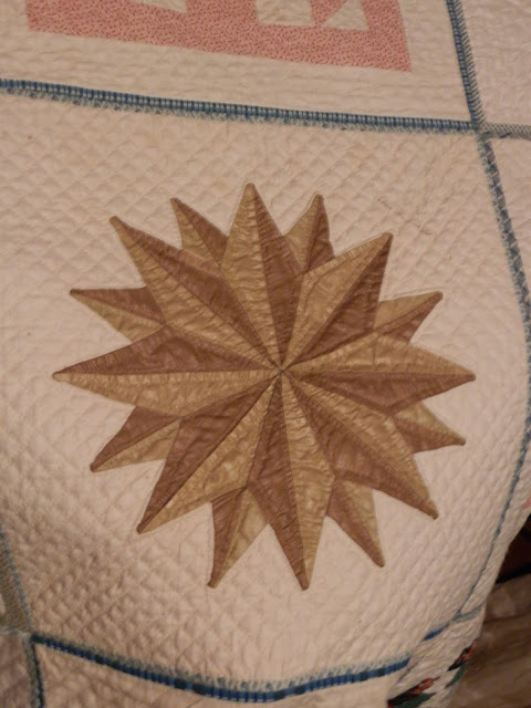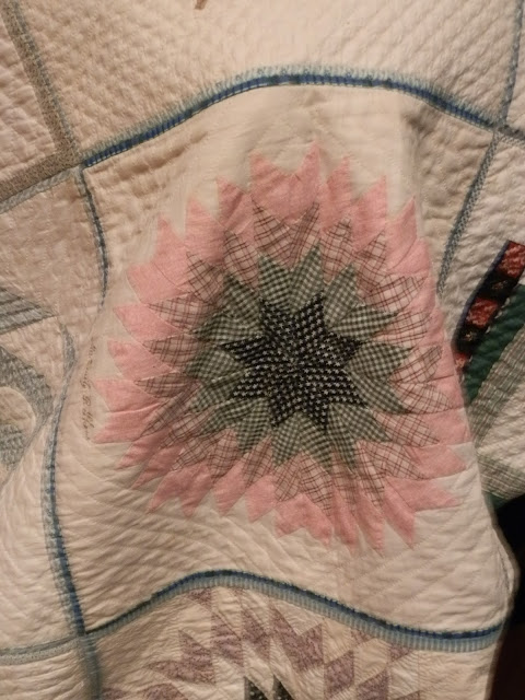 She held up the corners that were laying behind the trunk that it is displayed over, but did not show me the entire quilt (dang!). And she was a bit wobbly, so some are blurred. But she said that they put the quilt away in the winter, and display it again in the spring, and always with a different section showing up front. So I guess I'll be making several trips back to see it! And maybe get better pics then, too! :o)