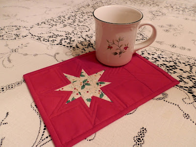 And I just finished the mug rug to go with it! It's a wonky star in fabric with holly sprigs on it......kindof matches, and I backed it with the holly fabric, too.